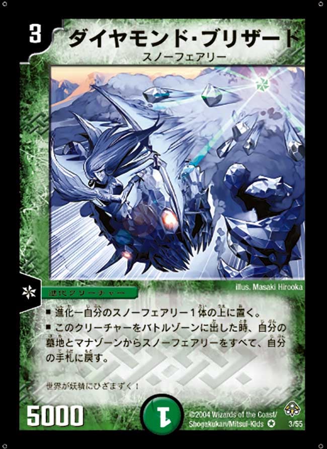 進化-自分のスノーフェアリー1体の上に置く。このクリーチャーをバトルゾーンに出した時、自分の墓地とマナゾーンからスノーフェアリーをすべて、自分の手札に戻す。