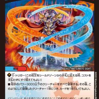 進化―自分の火のクリーチャー1体の上に置く。侵略―火のコマンド(自分の火のコマンドが攻撃する時、自分の手札にあるこのクリーチャーをその上に重ねてもよい)W・ブレイカー(このクリーチャーはシールドを2つブレイクする)このクリーチャーがバトルゾーンに出た時、相手の「ブロッカー」を持つクリーチャー1体を破壊する。