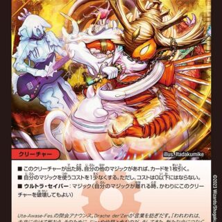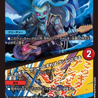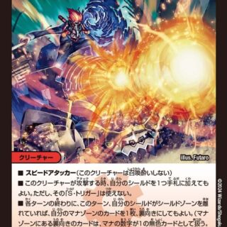 S・トリガー(このクリーチャーをシールドゾーンから手札に加える時、コストを支払わずにすぐ召喚してもよい)このクリーチャーが出た時、相手のコスト3以下のエレメントを1つ選んで破壊する。