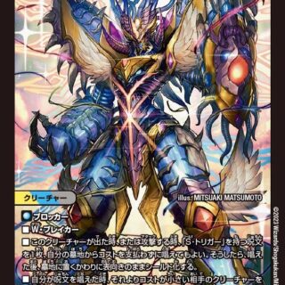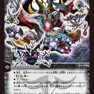 ブロッカースピードアタッカーW・ブレイカーこのクリーチャーがバトルゾーンに出た時、自分のシールドを1つ、手札に加えてもよい。ただし、その「S・トリガー」は使えない。このようにしてシールドを手札に加えたら、相手のクリーチャーを1体破壊する。鬼タイム:自分と相手のシールドの数が合計6つ以下で、自分のターンなら、このクリーチャーは破壊されない。