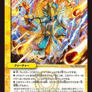 スピードアタッカーこのクリーチャーが攻撃する時、相手のパワー5000以下のクリーチャーを1体破壊する。レインボーナス:各ターン、このクリーチャーがはじめて攻撃する時、バトルゾーンに自分の多色クリーチャーがあれば、このクリーチャーをアンタップする。