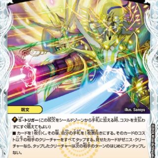 S・トリガー(このクリーチャーをシールドゾーンから手札に加える時、コストを支払わずにすぐ召喚してもよい)キリフダッシュ [nn02](自分のクリーチャーの攻撃の終わりに、そのクリーチャーがその攻撃中にシールドをブレイクしていれば、このクリーチャーを [nn02]支払って召喚してもよい)このクリーチャーをタップしてバトルゾーンに出してもよい。相手のクリーチャーが攻撃する時、可能ならこのクリーチャーを攻撃する。