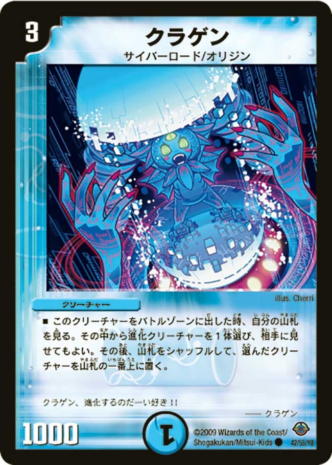 このクリーチャーをバトルゾーンに出した時、自分の山札を見る。その中から進化クリーチャーを1体選び、相手に見せてもよい。その後、山札をシャッフルして、選んだクリーチャーを山札の一番上に置く。