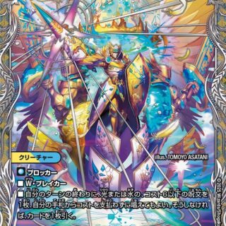 ブロッカーW・ブレイカー自分の光のコスト6以下のクリーチャーはすべてのバトルに勝つ。呪文の効果によって相手がクリーチャーを選ぶ時、このクリーチャーは選べない。
