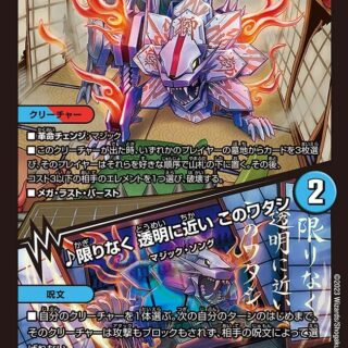 進化-自分の自然のクリーチャー1体の上に置く。W・ブレイカーこのクリーチャーが攻撃する時、このクリーチャーよりパワーの小さい相手のクリーチャーを1体選び、持ち主のマナゾーンに置く。革命2―自分のシールドが2つ以下なら、このクリーチャーのパワーを+9000し、「Q・ブレイカー」を与える。
