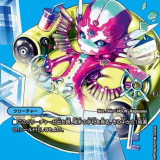 パワーアタッカー+4000(攻撃中、このクリーチャーのパワーは+4000される)W・ブレイカーこのクリーチャーが破壊された時、自分の山札を見る。その中から、コスト8以下の進化ではないハンターを1体選び、バトルゾーンに出してもよい。その後、山札をシャッフルする。