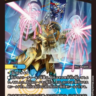 マナゾーンに置く時、このカードはタップして置く。超無限進化?光・水・火がすべて揃うように自分のクリーチャーを1体以上選び、その上に置く。このクリーチャーが相手のシールドをブレイクする時、相手はかわりにそのシールドをすべてのプレイヤーに見せる。そのシールドの中の呪文をすべて、自分がコストを支払わずに唱え、持ち主の墓地に置く。その後、このクリーチャーはそのシールドをブレイクする。T・ブレイカー(このクリーチャーはシールドを3枚ブレイクする)