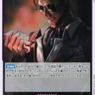 種類:CHARACTER コスト:<br>2 属性:斬 パワー:<br>2000 カウンター:<br>1000 色:<br>緑 ブロックアイコン: 特徴:<br>東の海 テキスト:<br>【自分のターン中】このキャラがレストになった時、相手のレストのコスト2以下のキャラ1枚までを、KOする。