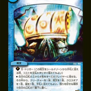 相手の超次元ゾーンにカードがあれば、このクリーチャーを[ff01]支払って召喚してもよい。このクリーチャーが出た時、自分のシールドを1つ手札に加える。ただし、その「S・トリガー」は使えない。