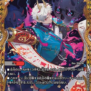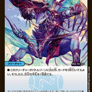 スーパー・S・トリガー(このクリーチャーを自分のシールドゾーンから手札に加える時、コストを支払わずにすぐ召喚してもよい。その時自分のシールドが1つもなければ、このクリーチャーにoB能力を与える)このクリーチャーがバトルゾーンに出た時、相手の手札を見ないで1枚選び、捨てさせる。oB このクリーチャーがバトルゾーンに出た時、相手は自身のアンタップしているクリーチャーを2体選び、破壊する。