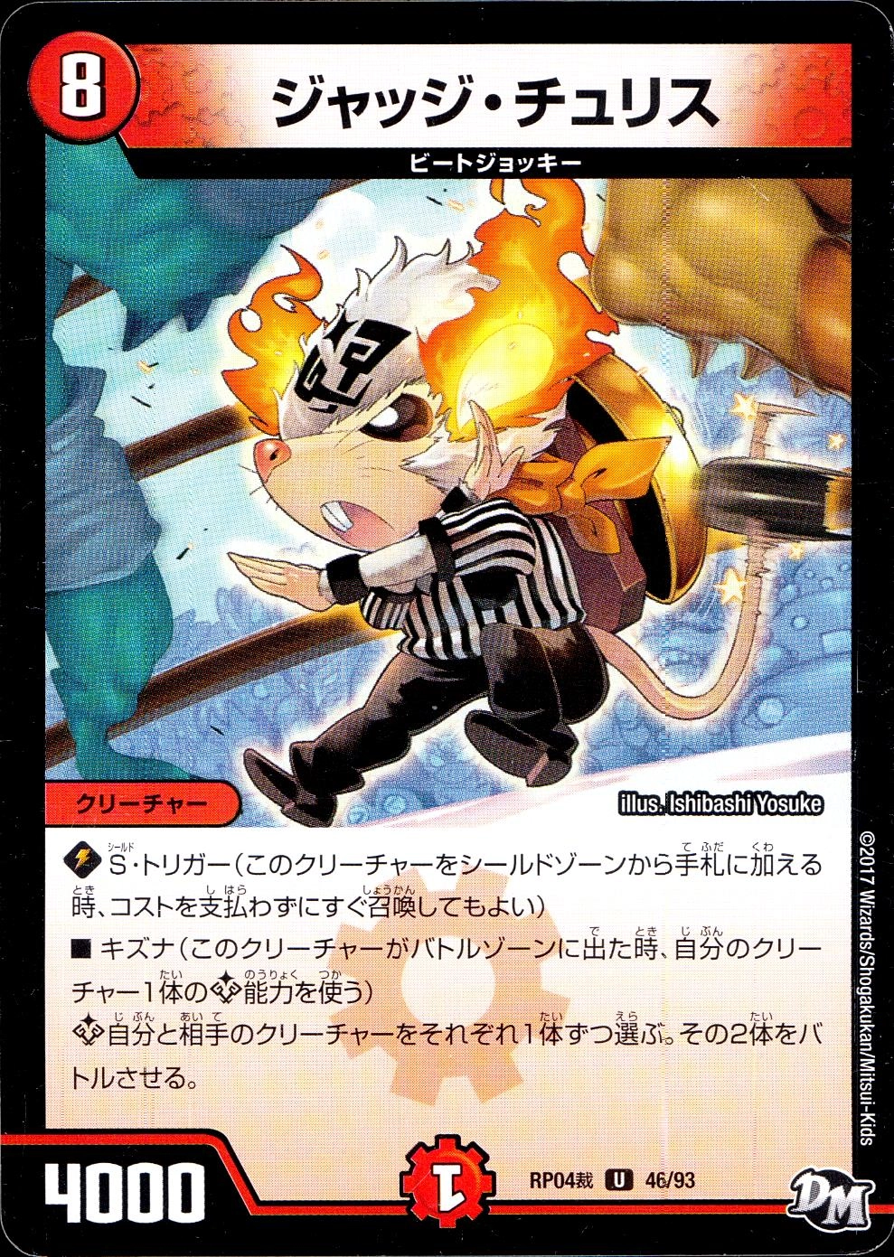 S・トリガー(このクリーチャーをシールドゾーンから手札に加える時、コストを支払わずにすぐ召喚してもよい)キズナ(このクリーチャーがバトルゾーンに出た時、自分のクリーチャー1体のP能力を使う)P自分と相手のクリーチャーをそれぞれ1体ずつ選ぶ。その2体をバトルさせる。
