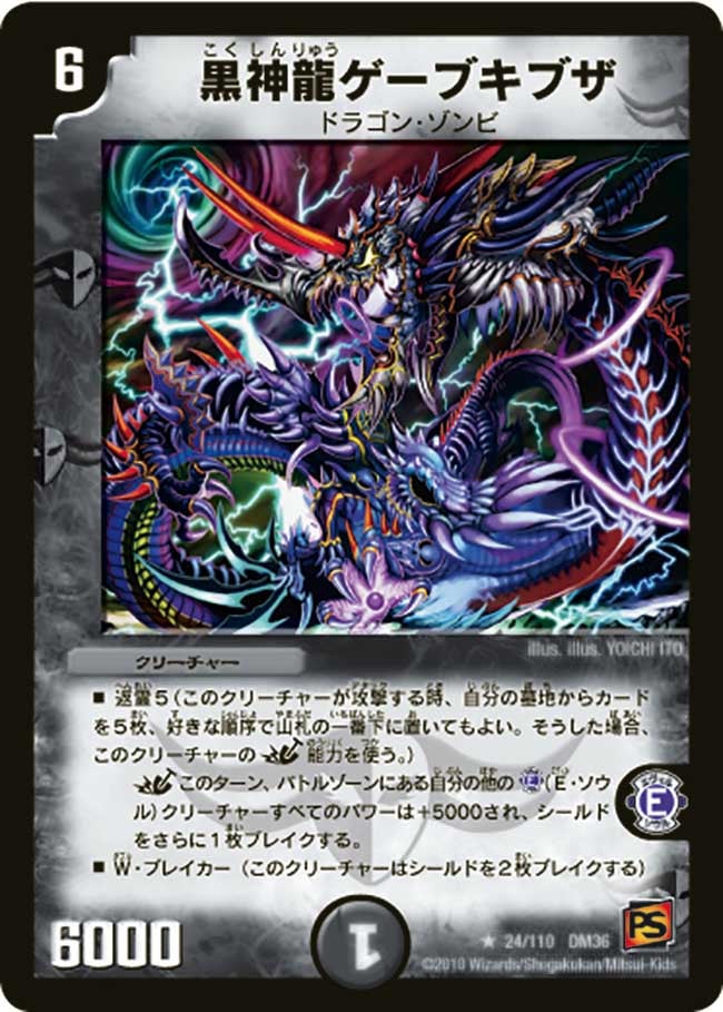 返霊5(このクリーチャーが攻撃する時、自分の墓地からカードを5枚、好きな順序で山札の一番下に置いてもよい。そうした場合、このクリーチャーの能力を使う。)このターン、バトルゾーンにある自分の他の(E・ソウル)クリーチャーすべてのパワーは+5000され、シールドをさらに1枚ブレイクする。W・ブレイカー(このクリーチャーはシールドを2枚ブレイクする)