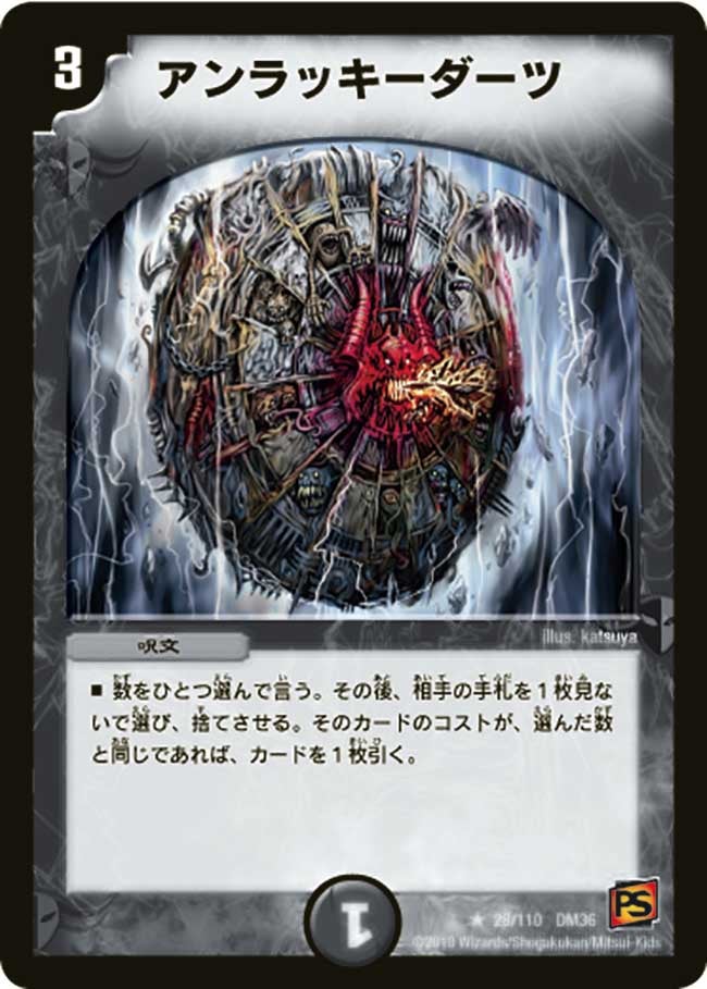 数をひとつ選んで言う。その後、相手の手札を1枚見ないで選び、捨てさせる。そのカードのコストが、選んだ数と同じであれば、カードを1枚引く。