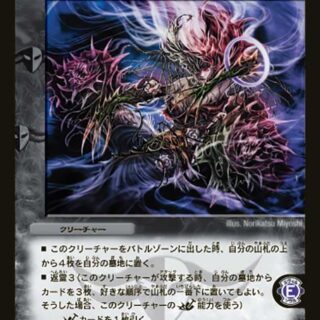 W・ブレイカー(このクリーチャーはシールドを2枚ブレイクする)自分のターン中に、このクリーチャーがタップされていた場合、相手のクリーチャーがバトルゾーンに出る時、そのクリーチャーはバトルゾーンに出るかわりに持ち主の墓地に置かれる。