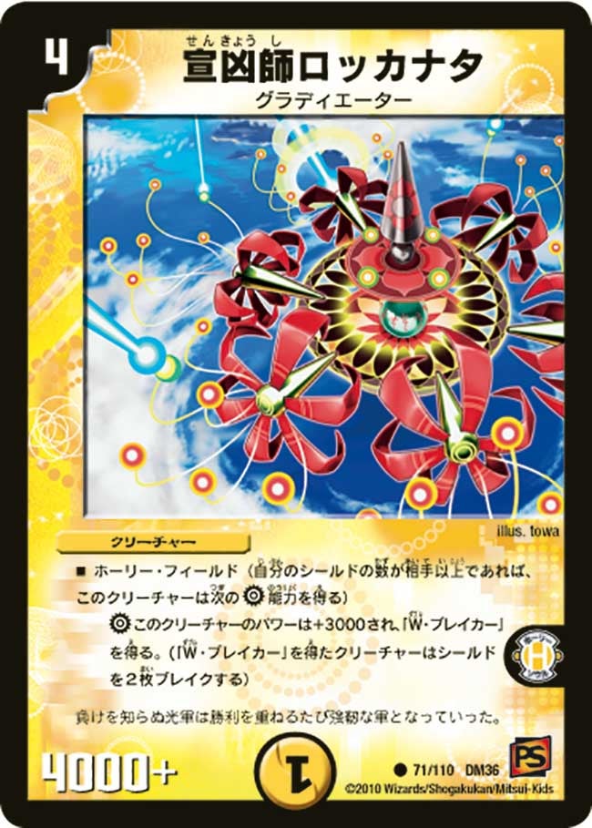 ホーリー・フィールド(自分のシールドの数が相手以上であれば、このクリーチャーは次の能力を得る)このクリーチャーのパワーは+3000され、「W・ブレイカー」を得る。(「W・ブレイカー」を得たクリーチャーはシールドを2枚ブレイクする)