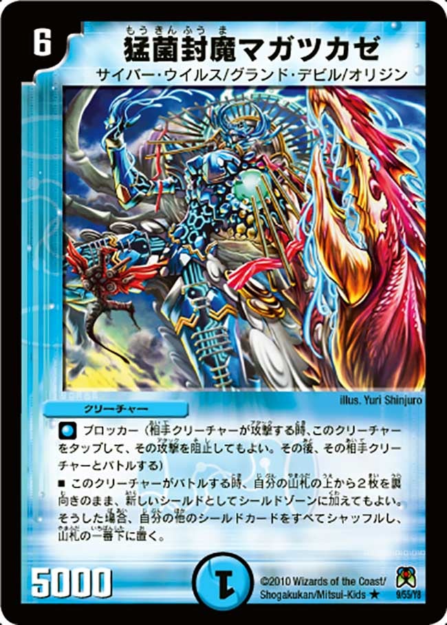 ブロッカー(相手クリーチャーが攻撃する時、このクリーチャーをタップして、その攻撃を阻止してもよい。その後、その相手クリーチャーとバトルする)このクリーチャーがバトルする時、自分の山札の上から2枚を裏向きのまま、新しいシールドとしてシールドゾーンに加えてもよい。そうした場合、自分の他のシールドカードをすべてシャッフルし、山札の一番下に置く。