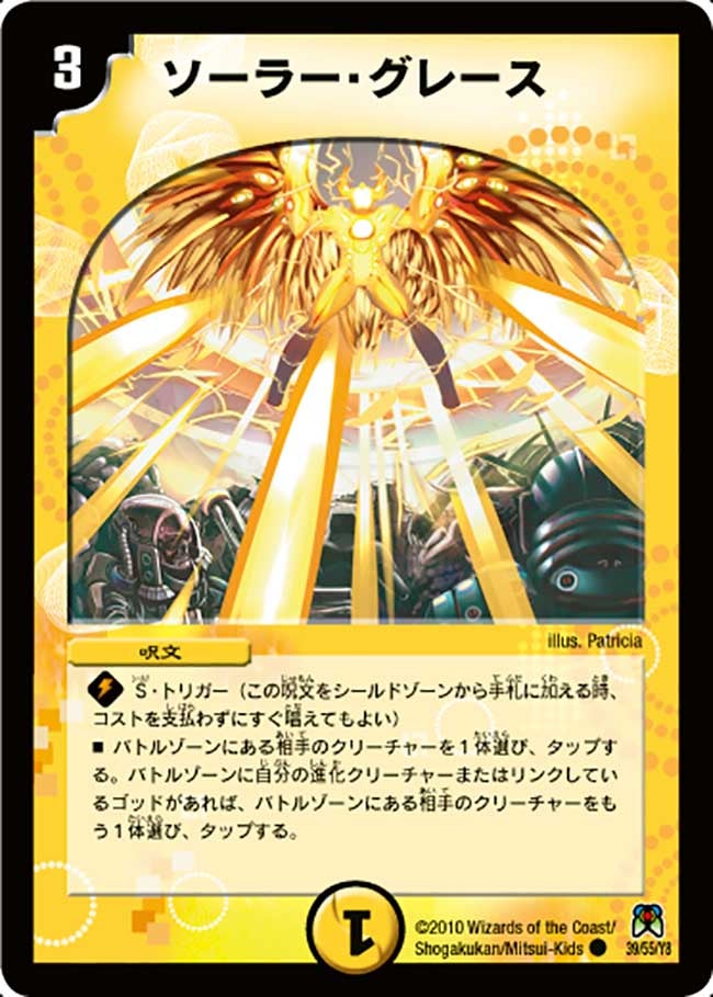 S・トリガー(この呪文をシールドゾーンから手札に加える時、コストを支払わずにすぐ唱えてもよい)バトルゾーンにある相手のクリーチャーを1体選び、タップする。バトルゾーンに自分の進化クリーチャーまたはリンクしているゴッドがあれば、バトルゾーンにある相手のクリーチャーをもう1体選び、タップする。