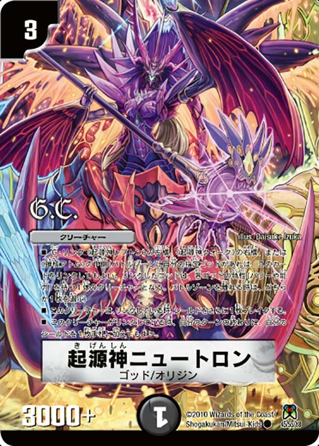 G・リンク《起源神レプトン》の左横、《起源神クォーク》の右横、または《神核アトム》の下側(バトルゾーンに自分の指定ゴッドがあれば、このカードをリンクしてもよい。リンクしたゴッドは、各ゴッドの特性〔パワーや能力〕を持つ1体のクリーチャーとなる。バトルゾーンを離れる時は、どちらか1枚を選ぶ)このクリーチャーは、リンクしている時、シールドをさらに1枚ブレイクする。このクリーチャーがリンクしている時、自分のターンの終わりに、自分のシールドを1枚手札に加えてもよい。