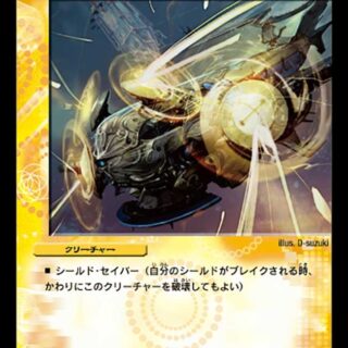 自分の手札を1枚裏向きにし、新しいシールドとしてシールドゾーンに加える。バトルゾーンに自分のパワー6000以上のクリーチャーがあれば、カードを1枚引いてもよい。