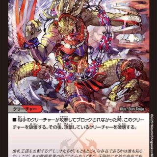 このクリーチャーが攻撃する時、相手のパワー3000以下のクリーチャーを1体破壊する。覚醒 – 自分のターンのはじめに、相手のシールドが2枚以下であれば、このクリーチャーをコストの大きいほうに裏返す。 (ゲーム開始時、サイキック・クリーチャーは山札には含めず、自分の超次元ゾーンに置き、バトルゾーン以外のゾーンに行った場合、そこに戻す)