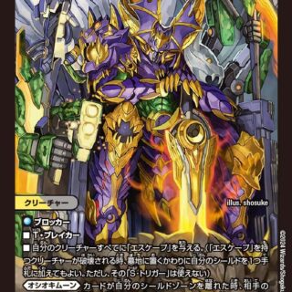 G-NEO進化:水、闇、または火のクリーチャー1体の上に置いてもよい。(カードが下にあれば、NEO進化クリーチャーとして扱い、離れる時、かわりに下のカードすべてが離れる)スレイヤー(このクリーチャーがバトルする時、バトルの後、相手クリーチャーを破壊する)W・ブレイカー(このクリーチャーはシールドを2つブレイクする)