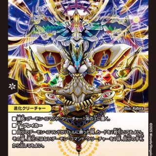 スター進化:レクスターズ、火のクリーチャー、または自然のクリーチャー1体の上に置く。(このクリーチャーが離れる時、かわりに一番上のカードが離れる)T・ブレイカー(このクリーチャーはシールドを3つブレイクする)バトル中、このクリーチャーのパワーを+3000する。このクリーチャーが出た時、相手のクリーチャーを1体選んでもよい。このクリーチャーとその選んだクリーチャーをバトルさせる。このクリーチャーが攻撃する時、自分の山札の上から1枚目をマナゾーンに置いてもよい。