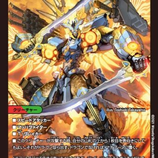 サバキZ(裁きの紋章が自分のシールドゾーンから手札に加えられた時、そのカードを捨ててもよい。そうしたら、この呪文をコストを支払わずに唱える)自分の山札の上から2枚を表向きにする。その中からドラゴン、メタリカ、呪文をすべて手札に加え、残りを好きな順序で山札の一番下に置く。この呪文を自分の手札から唱えた後、自分のシールド1つの上に、表向きにして置く。(そのシールドの束は1つと数える)