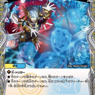 このカードは、ゲーム開始時の5枚の手札に含める。この鼓動は、封印を4つ付けてバトルゾーンに出す。禁断解放―この鼓動の封印がすべてなくなった時、クリーチャー側に裏返す。(カードを封印するには、自分の山札の上から1枚目を裏向きのままそのカードの上に置く。コマンドがバトルゾーンに出た時、その持ち主はそのコマンドと同じ文明を持つ自身のカードから封印をひとつ、墓地に置く。クリーチャーが封印されている間、両プレイヤーはそのクリーチャーを無視する)