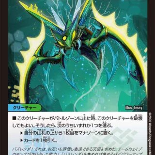このクリーチャーが攻撃する時、自分のシールドをひとつ墓地に置いてもよい。そうした場合、自分の墓地から闇のコマンドを2体まで、新しいシールドとして自分のシールドゾーンに裏向きにして加える。W・ブレイカーこのクリーチャーが破壊される時、墓地に置くかわりに自分の手札にある闇のクリーチャーを1体捨ててもよい。
