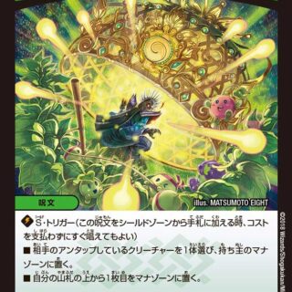 oS このクリーチャーが攻撃するとき、自分の山札の上から1枚目を表向きにする。そのカードがサバイバーであれば自分の手札に加え、サバイバーでなければ自分の墓地に置く。 サバイバー(このクリーチャーがバトルゾーンにある間、自分の他のサバイバーも上のoS 能力を得る)