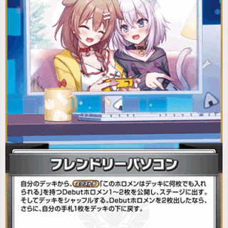 能力テキスト:このカードは、自分の手札がこのカードを含まずに6枚以下でなければ使えない。自分のデッキの上から4枚を見る。その中から、#お酒を持つホロメンを好きな枚数公開し、公開したホロメンを手札に加える。そして残ったカードを好きな順でデッキの下に戻す。LIMITED:ターンに1枚しか使えない。