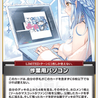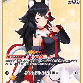 能力テキスト:このマスコットが付いているホロメンのアーツ+10。◆#5期生を持つ1st以上のホロメンに付いていたら能力追加[バックポジション限定]このマスコットが付いているホロメンは相手からダメージを受けない。マスコットは、自分のホロメン1人につき1枚だけ付けられる。