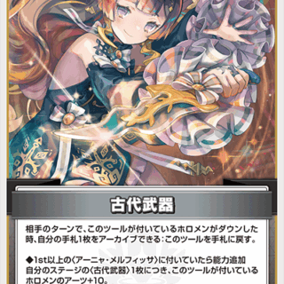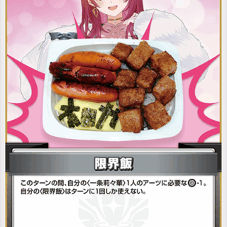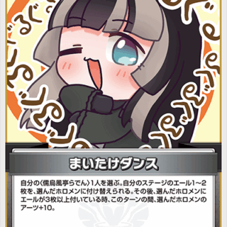 能力テキスト:このマスコットが付いているホロメンのアーツ+10。◆〈ラプラス・ダークネス〉に付いていたら能力追加[コラボポジション限定][ターンに1回]自分のメインステップで、サイコロを1回振れる:奇数の時、このマスコットが付いているホロメンをバックポジションに移動する。マスコットは、自分のホロメン1人につき1枚だけ付けられる。
