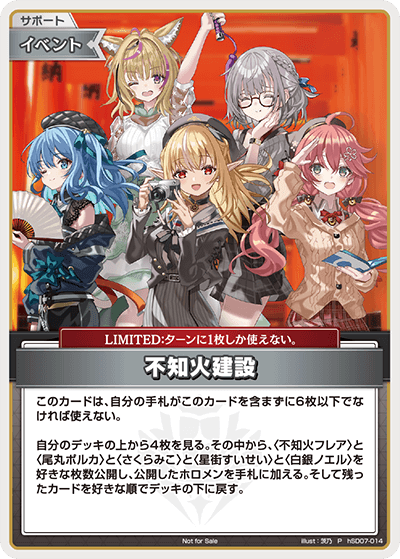 能力テキスト:このカードは、自分の手札がこのカードを含まずに6枚以下でなければ使えない。自分のデッキの上から4枚を見る。その中から、〈不知火フレア〉と〈尾丸ポルカ〉と〈さくらみこ〉と〈星街すいせい〉と〈白銀ノエル〉を好きな枚数公開し、公開したホロメンを手札に加える。そして残ったカードを好きな順でデッキの下に戻す。LIMITED:ターンに1枚しか使えない。