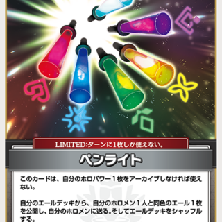 能力テキスト:このカードは、自分のホロパワー1枚をアーカイブしなければ使えない。自分のエールデッキから、自分のホロメン1人と同色のエール1枚を公開し、自分のホロメンに送る。そしてエールデッキをシャッフルする。LIMITED:ターンに1枚しか使えない。