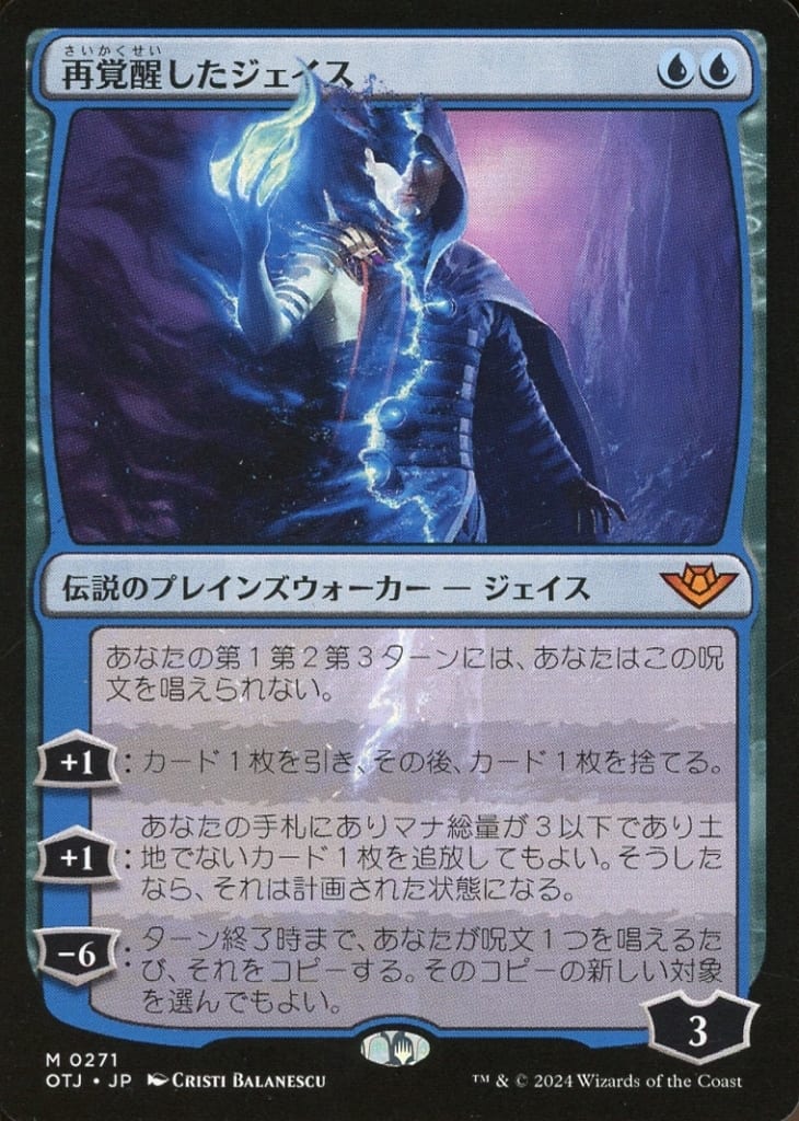 再覚醒したジェイス/Jace Reawakened (青)(青)伝説のプレインズウォーカー ― ジェイス(Jace) OTJ, 神話レアあなたの第1第2第3ターンには、あなたはこの呪文を唱えられない。[+1]:カード1枚を引き、その後、カード1枚を捨てる。[+1]:あなたの手札にありマナ総量が3以下であり土地でないカード1枚を追放してもよい。そうしたなら、それは計画された状態になる。[-6]:ターン終了時まで、あなたが呪文1つを唱えるたび、それをコピーする。そのコピーの新しい対象を選んでもよい。3Illus.Chris Rallis (306/0)