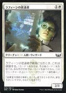 ラフィーンの密通者/Raffine's Informant (らふぃーんのみっつうしゃ) (1)(白)クリーチャー ― 人間(Human)・ウィザード(Wizard) SNC, コモンラフィーンの密通者が戦場に出たとき、これは謀議する。(カード1枚を引き、その後カード1枚を捨てる。あなたが土地でないカードを捨てたなら、このクリーチャーの上に+1/+1カウンター1個を置く。)2/1Illus.John Stanko (26/281)