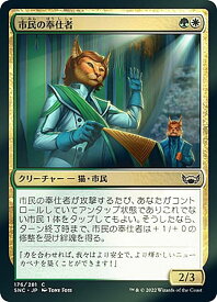 市民の奉仕者/Civil Servant (しみんのほうししゃ) (緑)(白)クリーチャー ― 猫(Cat)・市民(Citizen) SNC, コモン市民の奉仕者が攻撃するたび、あなたがコントロールしていてアンタップ状態でありこれでない市民(Citizen)1体をタップしてもよい。そうしたなら、ターン終了時まで、市民の奉仕者は+1/+0の修整を受け絆魂を得る。2/3Illus.Tony Foti (176/281)