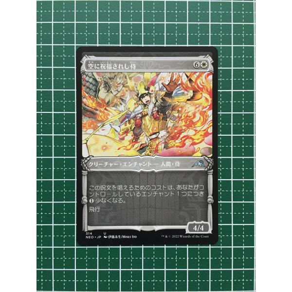 空に祝福されし侍/Sky-Blessed Samurai (そらにしゅくふくされしさむらい) (6)(白)クリーチャー・エンチャント ― 人間(Human)・侍(Samurai) NEO, アンコモンこの呪文を唱えるためのコストは、あなたがコントロールしているエンチャント1つにつき(1)少なくなる。飛行4/4Illus.伊藤未生/Misei Ito (314/302)
