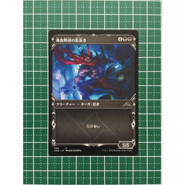 毒血勢団の影歩き/Dokuchi Shadow-Walker (どくちせいだんのかげあるき) (4)(黒)(黒)クリーチャー ― オーガ(Ogre)・忍者(Ninja) NEO, コモン忍術(3)(黒)((3)(黒),あなたがコントロールしていてブロックされなかった攻撃クリーチャー1体を手札に戻す:あなたの手札にあるこのカードをタップ状態かつ攻撃している状態で戦場に出す。)5/5Illus.山宗/SANSYU (339/302)