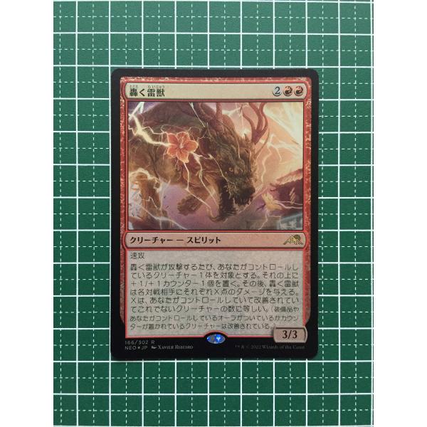 轟く雷獣/Thundering Raiju (とどろくらいじゅう) (2)(赤)(赤)クリーチャー ― スピリット(Spirit) NEO, レア速攻轟く雷獣が攻撃するたび、あなたがコントロールしているクリーチャー1体を対象とする。それの上に+1/+1カウンター1個を置く。その後、轟く雷獣は各対戦相手にそれぞれX点のダメージを与える。Xは、あなたがコントロールしていてこれでない改善されているクリーチャーの数に等しい。(装備品(Equipment)やあなたがコントロールしているオーラ(Aura)がついているかカウンターが置かれているクリーチャーは改善されている。)3/3Illus.Xavier Ribeiro (472/302)