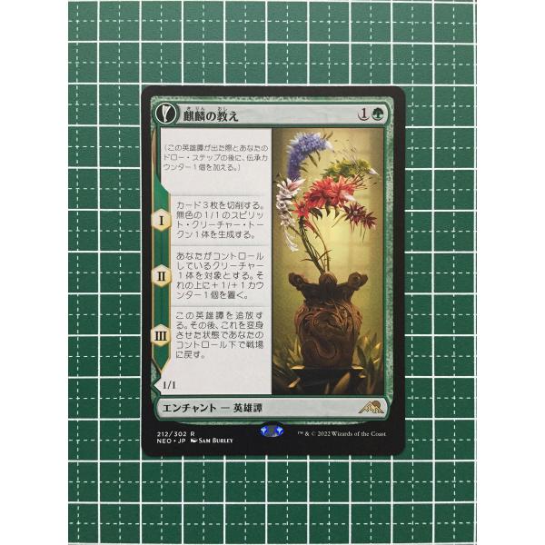 麒麟の教え/Teachings of the Kirin (きりんのおしえ) (1)(緑)エンチャント ― 英雄譚(Saga) NEO, レア(この英雄譚(Saga)が出た際とあなたのドロー・ステップの後に、伝承(lore)カウンター1個を加える。)I ― カード3枚を切削する。無色の1/1のスピリット(Spirit)・クリーチャー・トークン1体を生成する。II ― あなたがコントロールしているクリーチャー1体を対象とする。それの上に+1/+1カウンター1個を置く。III ― この英雄譚を追放する。その後、これを変身させた状態であなたのコントロール下で戦場に戻す。麒麟触れの大蛇/Kirin-Touched Orochi (きりんぶれのおろち)〔緑〕 クリーチャー・エンチャント ― 蛇(Snake)・モンク(Monk) NEO, レア麒麟触れの大蛇が攻撃するたび、以下から1つを選ぶ。・墓地にあるクリーチャー・カード1枚を対象とする。それを追放する。そうしたとき、無色の1/1のスピリット(Spirit)・クリーチャー・トークン1体を生成する。・墓地にありクリーチャーでないカード1枚を対象とする。それを追放する。そうしたとき、あなたがコントロールしているクリーチャー1体を対象とする。それの上に+1/+1カウンター1個を置く。1/1Illus.Sam Burley (482/302)