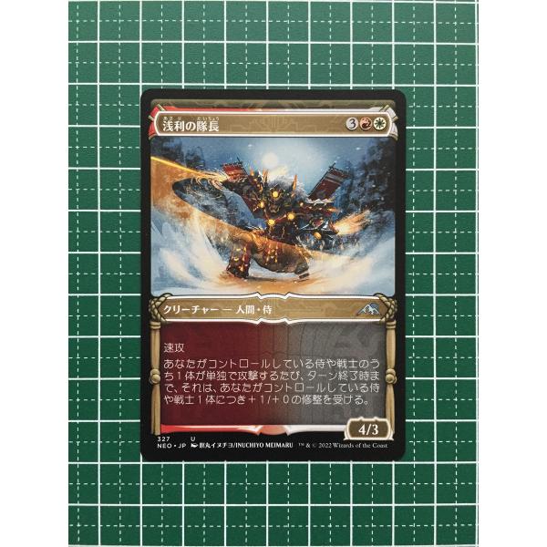 浅利の隊長/Asari Captain (あさりのたいちょう) (3)(赤)(白)クリーチャー ― 人間(Human)・侍(Samurai) NEO, アンコモン速攻あなたがコントロールしている侍(Samurai)や戦士(Warrior)のうち1体が単独で攻撃するたび、ターン終了時まで、それは、あなたがコントロールしている侍や戦士1体につき+1/+0の修整を受ける。4/3Illus.瞑丸イヌチヨ/INUCHIYO MEIMARU (327/302)