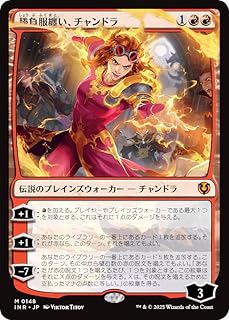 勝負服纏い、チャンドラ/Chandra, Dressed to Kill (しょうぶふくまといちゃんどら) (1)(赤)(赤)伝説のプレインズウォーカー ― チャンドラ(Chandra) INR, 神話レア[+1]:(赤)を加える。プレイヤーやプレインズウォーカーのうち最大1つを対象とする。勝負服纏い、チャンドラはそれに1点のダメージを与える。[+1]:あなたのライブラリーの一番上にあるカード1枚を追放する。それが赤であるなら、このターン、あなたはそれを唱えてもよい。[-7]:あなたのライブラリーの一番上にあるカード5枚を追放する。このターン、あなたはその中から望む数の赤の呪文を唱えてもよい。あなたは「あなたが赤の呪文を唱えるたび、クリーチャーやプレインズウォーカーやプレイヤーのうち1つを対象とする。この紋章はそれにX点のダメージを与える。Xは、その呪文を唱えるために支払ったマナの点数に等しい。」を持つ紋章を得る。3Illus.Viktor Titov (148/)