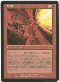 乱射/Scattershot (らんしゃ) (2)(赤)インスタント SCG, コモンクリーチャー1体を対象とする。乱射はそれに1点のダメージを与える。ストーム(あなたがこの呪文を唱えたとき、このターンにそれより前に唱えた呪文1つにつきそれを1回コピーする。あなたはそのコピーの新たな対象を選んでもよい。)Illus.Glen Angus (102/143)