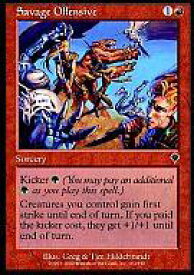 野蛮な攻勢/Savage Offensive (やばんなこうせい) (1)(赤)ソーサリー INV, コモンキッカー(緑)(あなたがこの呪文を唱えるに際し、あなたは追加の(緑)を支払ってもよい。)ターン終了時まで、あなたがコントロールするクリーチャーは先制攻撃を得る。この呪文がキッカーされていたなら、ターン終了時まで、それらはそれぞれ+1/+1の修整を得る。Illus.Greg & Tim Hildebrandt (162/350)