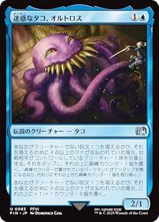 迷惑なタコ、オルトロス/Ultros, Obnoxious Octopus (1)(青)伝説のクリーチャー ― タコ(Octopus) FIN, アンコモンあなたがクリーチャーでない呪文1つを唱えるたび、それを唱えるために4点以上のマナが支払われていた場合、対戦相手がコントロールしているクリーチャー1体を対象とする。それをタップし、それの上に麻痺(stun)カウンター1個を置く。(麻痺カウンターが置かれているパーマネントがアンタップ状態になるなら、代わりにそれの上から麻痺カウンター1個を取り除く。)あなたがクリーチャーでない呪文1つを唱えるたび、それを唱えるために8点以上のマナが支払われていた場合、これの上に+1/+1カウンター8個を置く。2/1Illus.Domenico Cava (442/0)