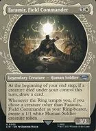 野戦指揮官、ファラミア/Faramir, Field Commander (やせんしきかんふぁらみあ) (3)(白)伝説のクリーチャー ― 人間(Human)・兵士(Soldier) LTR, アンコモンあなたの終了ステップの開始時に、このターンにクリーチャーがあなたのコントロール下で死亡していた場合、カード1枚を引く。指輪があなたを誘惑するたび、あなたが野戦指揮官、ファラミアでないクリーチャーをあなたの指輪所持者に選んだ場合、白の1/1の人間(Human)・兵士(Soldier)クリーチャー・トークン1体を生成する。3/3Illus.Dominik Mayer (303/)