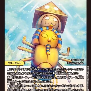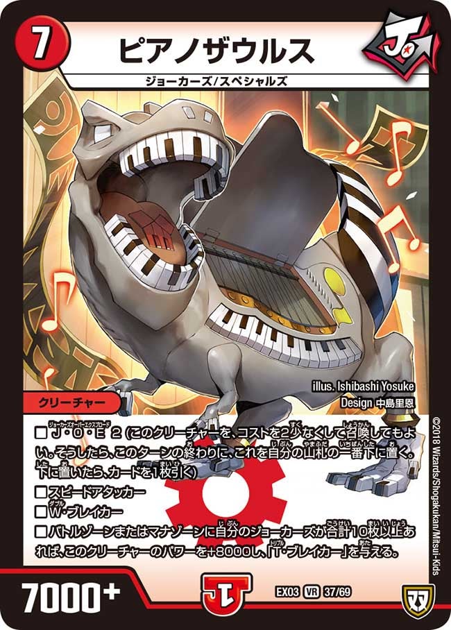 DMEX03 37/69 カードの種類:クリーチャー 文明:火 レアリティ:VR パワー:7000 コスト:7 マナ:1 種族:ジョーカーズ/スペシャルズ イラストレーター:Ishibashi Yosuke Design 中島里恩 特殊能力: J・O・E 2 (このクリーチャーを、コストを2少なくして召喚してもよい。そうしたら、このターンの終わりに、これを自分の山札の一番下に置く。下に置いたら、カードを1枚引く)スピードアタッカーW・ブレイカーバトルゾーンまたはマナゾーンに自分のジョーカーズが合計10枚以上あれば、このクリーチャーのパワーを+8000し、「T・ブレイカー」を与える。
