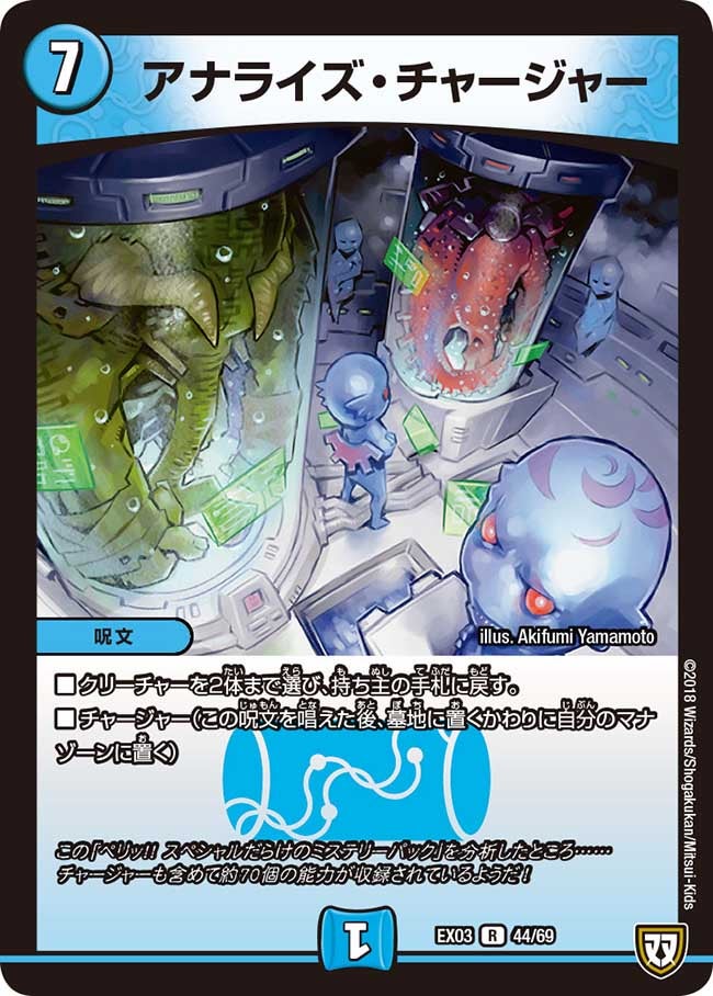 DMEX03 44/69 カードの種類:呪文 文明:水 レアリティ:R コスト:7 マナ:1 イラストレーター:Akifumi Yamamoto 特殊能力: クリーチャーを2体まで選び、持ち主の手札に戻す。チャージャー(この呪文を唱えた後、墓地に置くかわりに自分のマナゾーンに置く) フレーバー: この「ペリッ!! スペシャルだらけのミステリーパック」を分析したところ……チャージャーも含めて約70個の能力が収録されているようだ!
